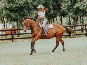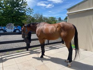 Dee is a super sweet and easy going mare who loves people and horses. She will greet you in the paddock, is an angel with her feet (barefoot) and to float (self loads), has no vices, and is a great doer. She is a sensitive, forward horse with a soft mouth.