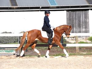 "Nina" is a 6vo. 14.2hh (approx) Welsh x GRP chestnut mare, by the very well known Noble Dancer (IMP) - a multi young pony national champion and prolific winner right through to PSG, and more recently excelling in the childrens events with his young riders. Noble Dancer is now gelded and his semen is sold out, so this bloodline is very precious indeed. Nina is out of the Welsh B mare Karanga Watercolours, Karanga stud are well known for breeding